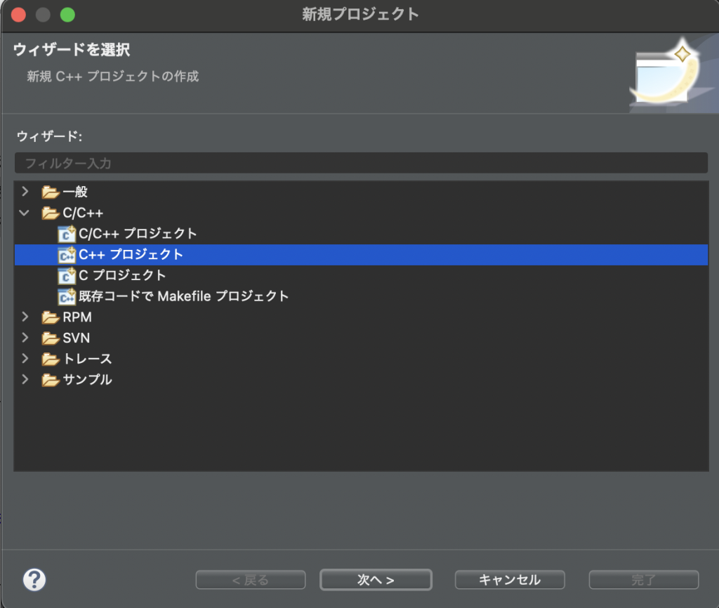 ② 「C/C++」から「C++プロジェクト」を選択し、「次へ」をクリックします。
