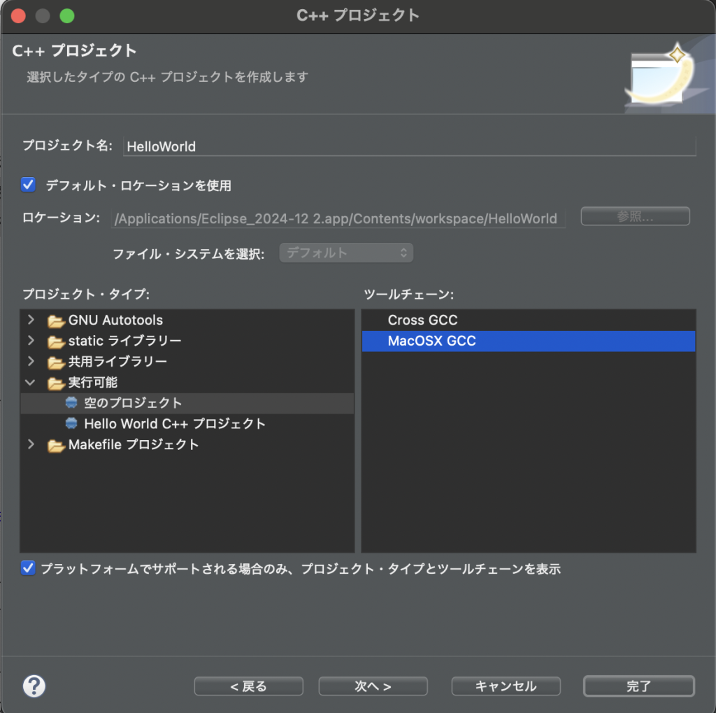 • ツールチェーンを「MacOSX GCC」に選択